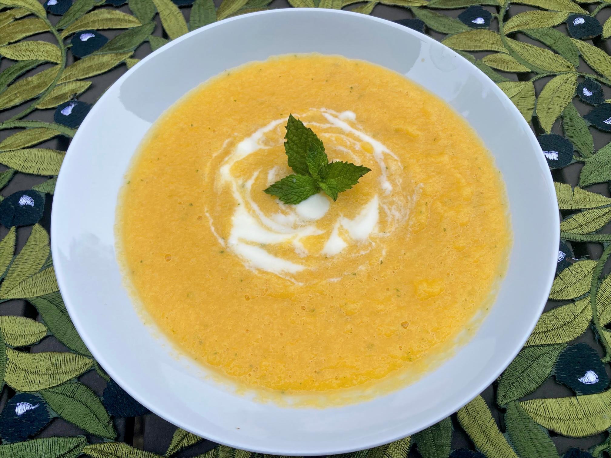 2. To serve, pour the soup into bowls.  Garnish with a dollop of yogurt swirled and fresh mint sprigs.
