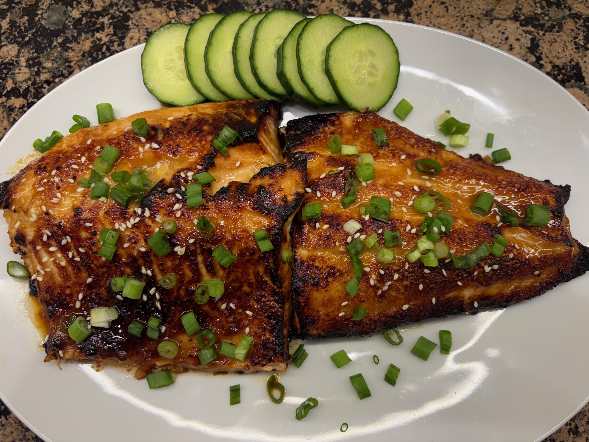 - To serve, place salmon on a large platter. Garnish with sliced green onions, sesame seeds, and sliced cucumbers.