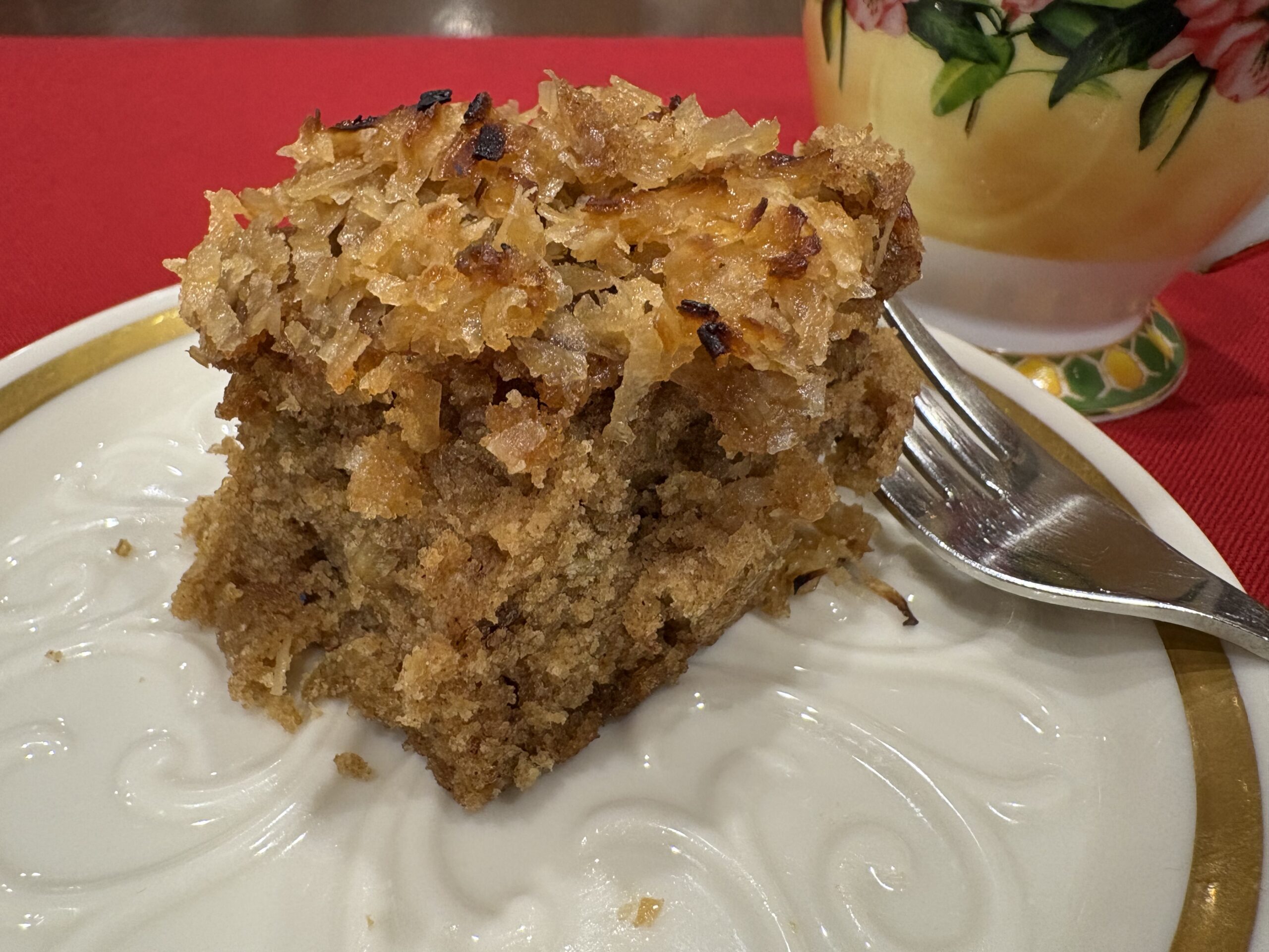 - Spread the topping evenly over the warm cake. Place under the broiler for 2 to 4 minutes until it bubbles and the coconut is golden brown.