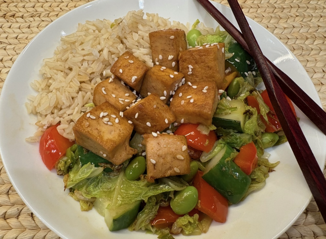 This recipe calls for two forms of soybeans — tofu and edamame. Tofu is made from mature soybeans that have been soaked, strained, cooked, and pressed into blocks. Edamame are young, fresh shelled soybeans. Both are nutritious while offering differences in texture and flavor to this veggie stir fry dish.